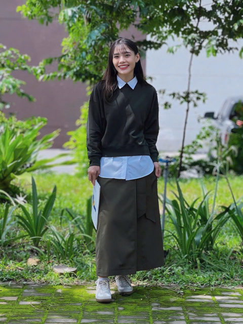 Một set đồ đơn giản nhưng không kém phần thời trang là sự kết hợp giữa áo sơ mi, áo nỉ và chân váy dài xẻ tà. Đầu tiên, áo sơ mi là lựa chọn lý tưởng để tạo nên vẻ ngoài thanh lịch, đặc biệt là những chiếc áo sơ mi trắng hay họa tiết kẻ sọc. Tiếp theo, áo nỉ sẽ giúp bạn giữ ấm cơ thể trong những ngày lạnh giá, đồng thời tạo điểm nhấn mạnh mẽ với những thiết kế tinh tế, phù hợp cho không khí Noel.